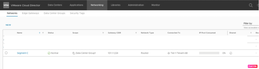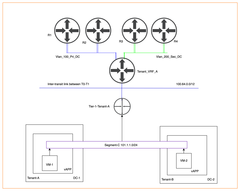 We will reuse previously created vAPP one in Tenant-A and another one in Tenant-B. A single segment-C will be created in vAPP of provider VDC-1 and attached to the existing Tier-1-Tenant-A gateway. The newly created segment “Segment-C” will be stretched using data center groups. Therefore, a new datacentre group “DC-1” will be created in Tenant-A and added to Tenant-B. “VM-1” Network connectivity will be tested from Provider VDC-1 and the same VM will be moved to tenant-B via manual failover., retaining the same IP address.