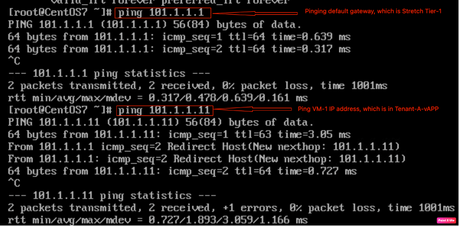 NB: In a production environment, VM will be moved to another provider VDC via a specific tool to minimize the downtime of an application running on the VM. We haven’t advertised Segment-C “101.1.1.0/24” subnet from Tier-0 to the physical environment. Therefore, make sure to follow the same process used in part-1 to advertise subnets to the physical routers.