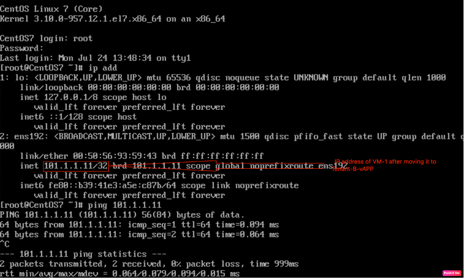 Move the VM-1 from Tenant-A-vAPP to Tenant-A-vAPP and verify the network connectivity
