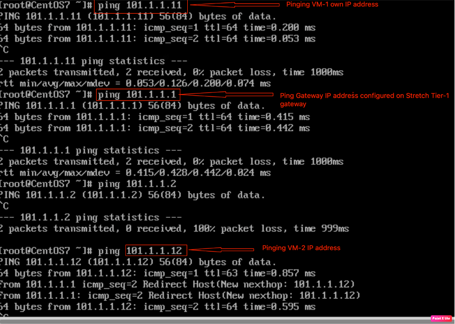 Pinging VM-2 and Gateway IP address from VM-1.