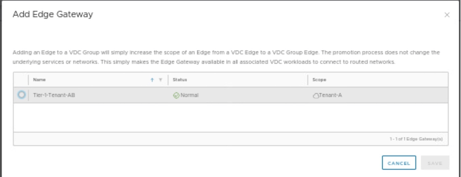 Select Tier-1 gateway, you want to stretch between Tenant-A and Tenant-B