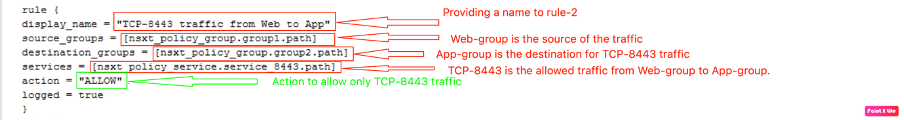 However, rule-2 will allow only “TCP-8443” traffic from “Web-group” to “App-group”.
