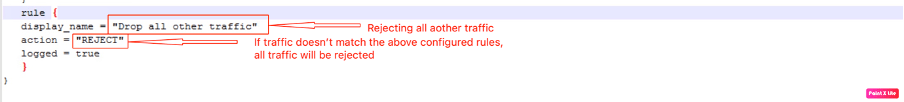 In the last step, we will configure rule-2 to reject all other traffic. We are not amending the default rule, which is “allow” by default.