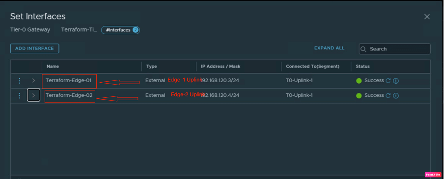 Now we will check the status of interfaces on the Tier-0 gateway. This Tier-0 has two interfaces, one is connecting on “Edge-1” and the second is connecting on “Edge-2”.