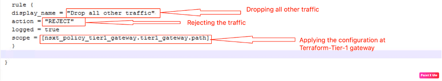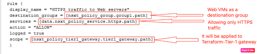 In this step, we will configure gateway firewall rules via Terraform, which will be applied to the “Terraform-Tier-1” gateway.