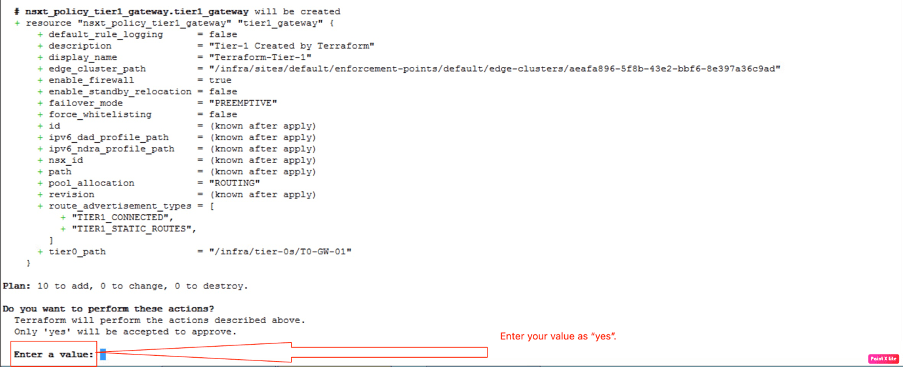 Before configuring any NSX-T logical constructs, Terraform will ask for your input, on whether to proceed with configuration or not. Enter the value as “yes”.