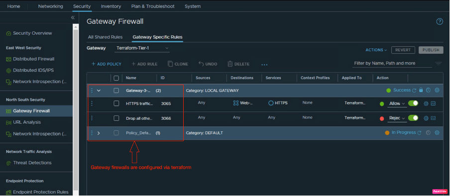 In the last part of the blog, we are also verifying the gateway firewall policies configured by Terraform. Navigate to security and go to Gateway Firewall.