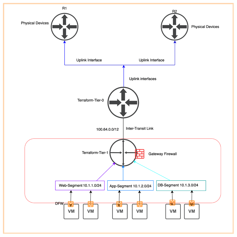 In the below diagram, we have a Tier-0 gateway connecting to both R1 and R2 via BGP. However, in our environment, we don’t have a Tier-1 gateway along with three logical segments “Web-Segment”, “App-Segment”, and “DB-Segment”. In this blog, we will create all components highlighted below in red via Terraform, including Distributed Firewalling and Gateway Firewalling. Any changes in the vSphere environment are completely out of the scope of this blog. All VMs in their respective logical segments will be connected manually, which can also be achieved via Terraform