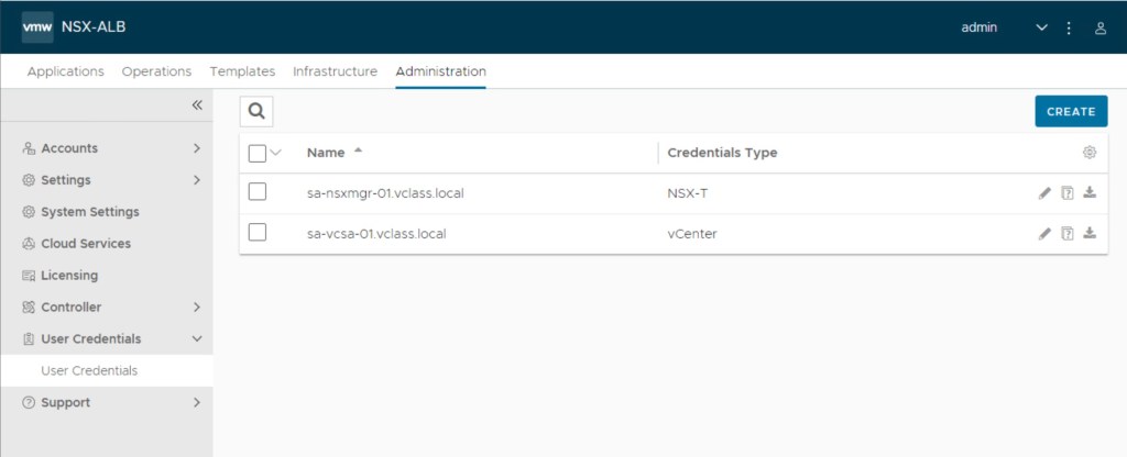 Now, we will verify the creation of users credentials for NSX-T and vCenter on the AVI controller. Navigate to Administration > User Credentials > User Credentials.