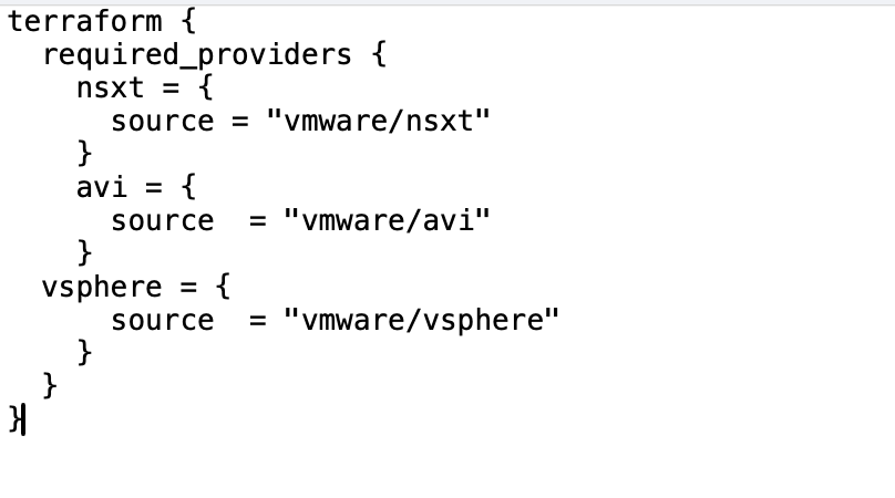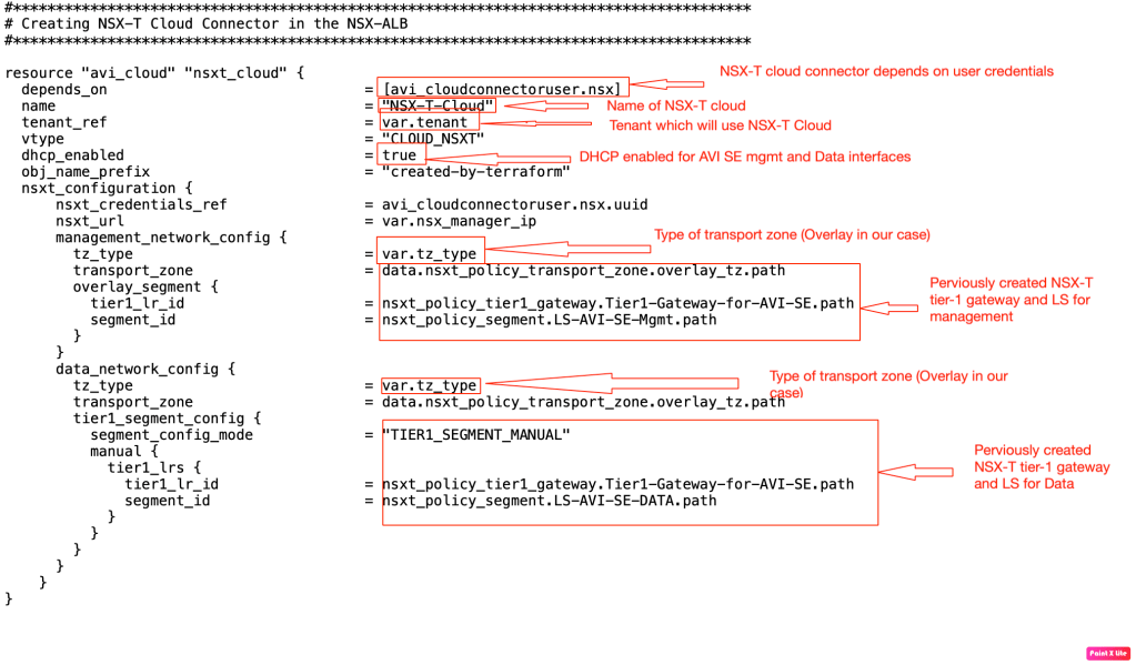 Now, a foundation has been laid and we can start creating NSX-T cloud in the AVI controller. Below steps will demonstrate the terraform configuration to deploy NSX-T cloud connector.
