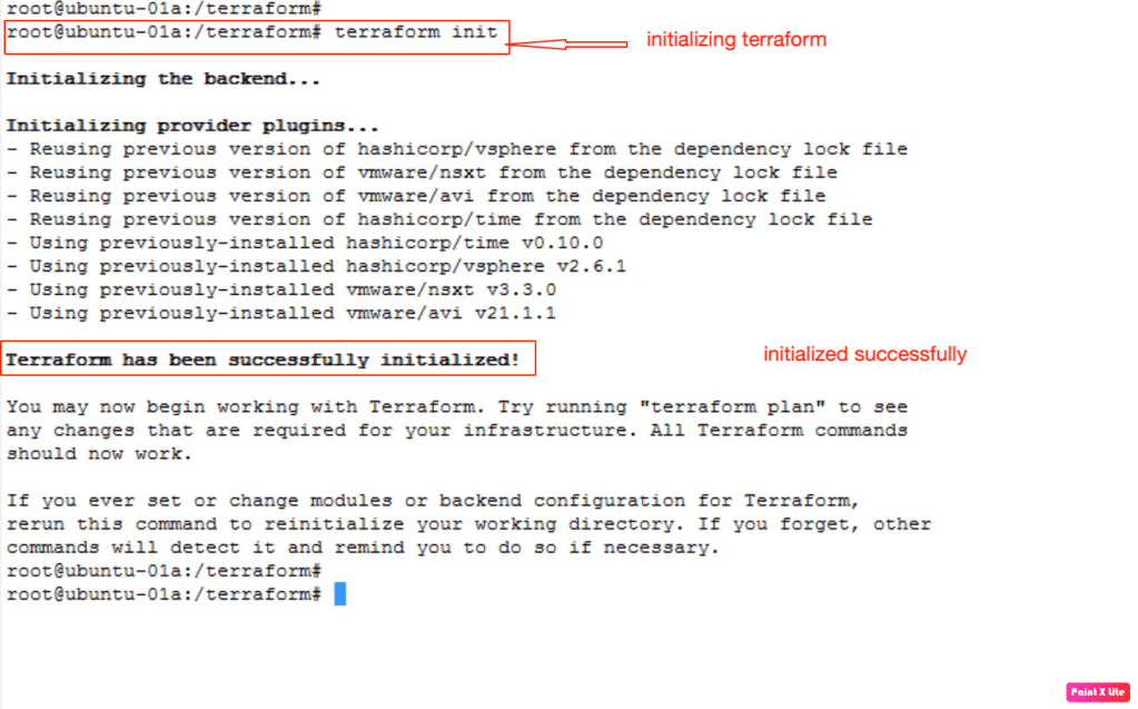 Now it is the time to initialise the terraform from the management PC to download latest versions of terraform providers (vSphere, NSX-T, AVI).