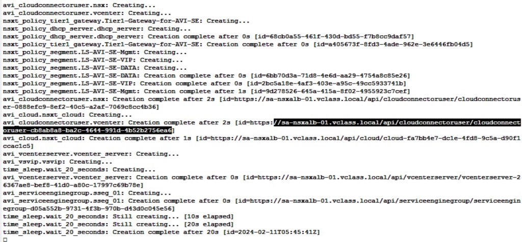 I have uploaded the terraform script used in part-1 and part-2 on git hub:- https://github.com/anujjain116/Infrastructure-as-a-Code–Automating-integration-of-NSX-T-with-NSX-ALB-via-Terraform