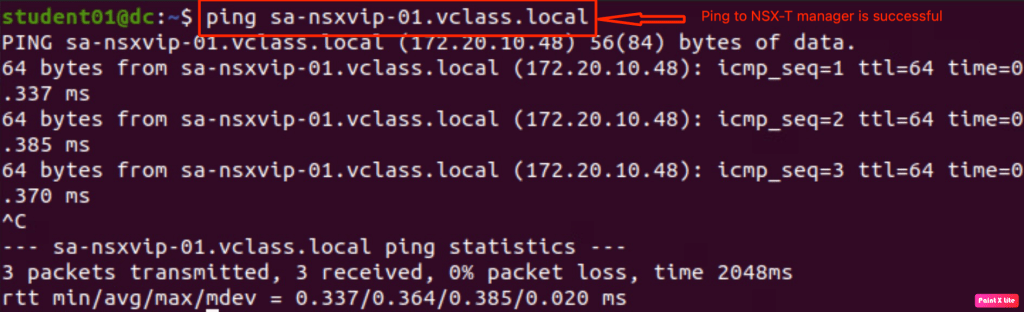 - Linux/Ubuntu Server is able to reach NSX-T manager on port 443. In below step, we have validated that the deployed server is able to reach NSX-T manager on both ICMP and HTTPS.