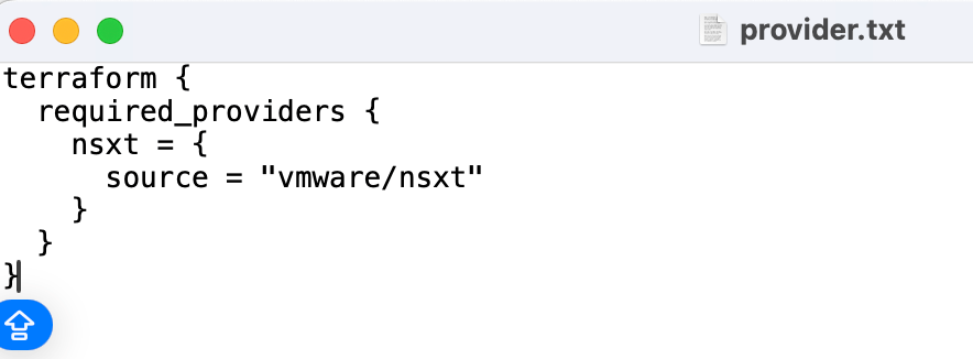 –> Provider.tf (this file will include all VMware providers like NSX-T, required for terraform to make changes.