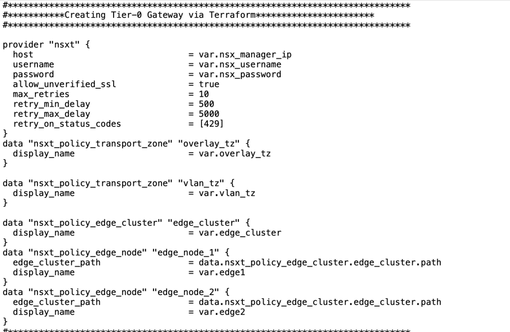 –> Main.tf – This is imperative terraform file that includes all the configuration to create necessary objects in the NSX-T environment. Any other terraform providers is out of the scope of this document.