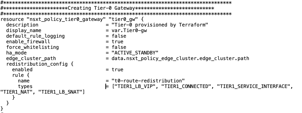 In this blog, we will configure Tier-0 gateway as active-standby and leverage the HA VIP to configure static routing and VIP address on it using terraform. We have already discussed about terraform couple of times. Please refer below blogs, in which we already showcased configuration of NSX-T logical constructs using terraform (https://vxlearners.com/2023/09/08/infrastructure-as-a-code-automating-nsx-t-via-terraform/)