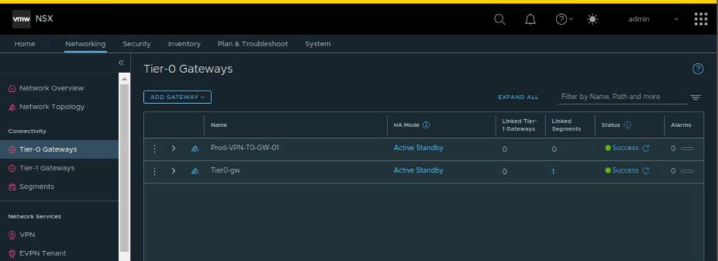 In the third step, we will provision a Tier-0 gateway which will be in Active-Standby Mode to leverage the functionality of HA VIP.