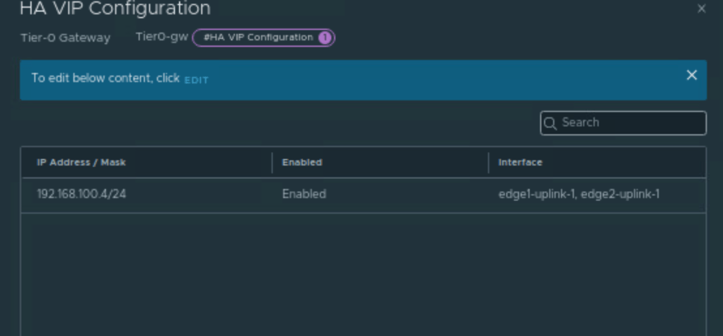 We have also created HA VIP address, lets validate it by clicking HA VIP on Tier-0 gateway.