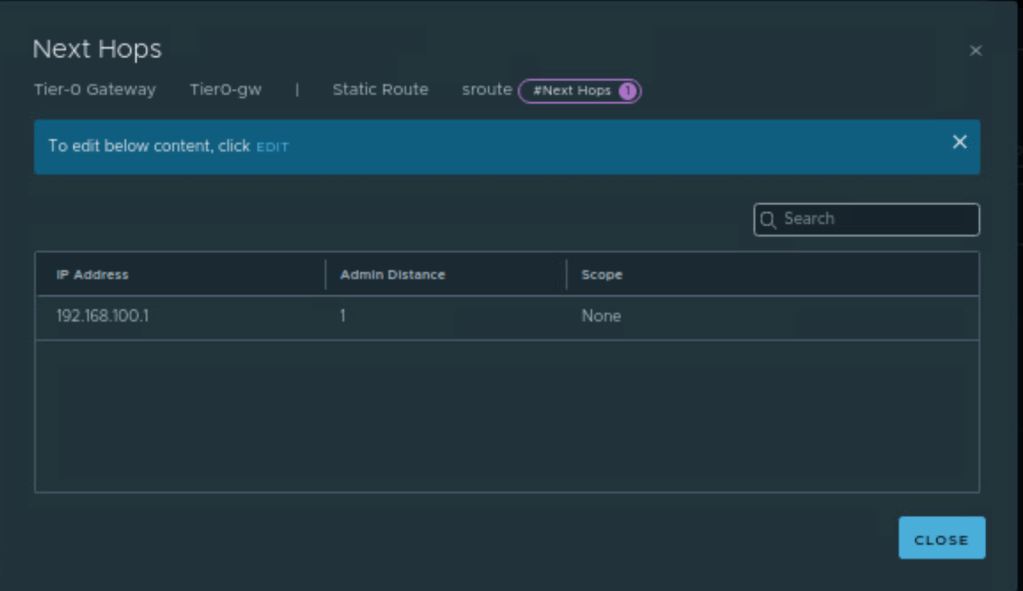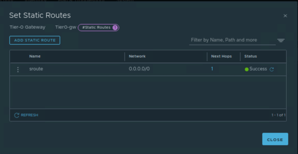 Up till now we have built each and every piece of the puzzle. Now it is right time to break the ice and create static route on Tier-0 gateway to point all traffic to “HSRP/VRRP” IP address of Physical R1/R2.