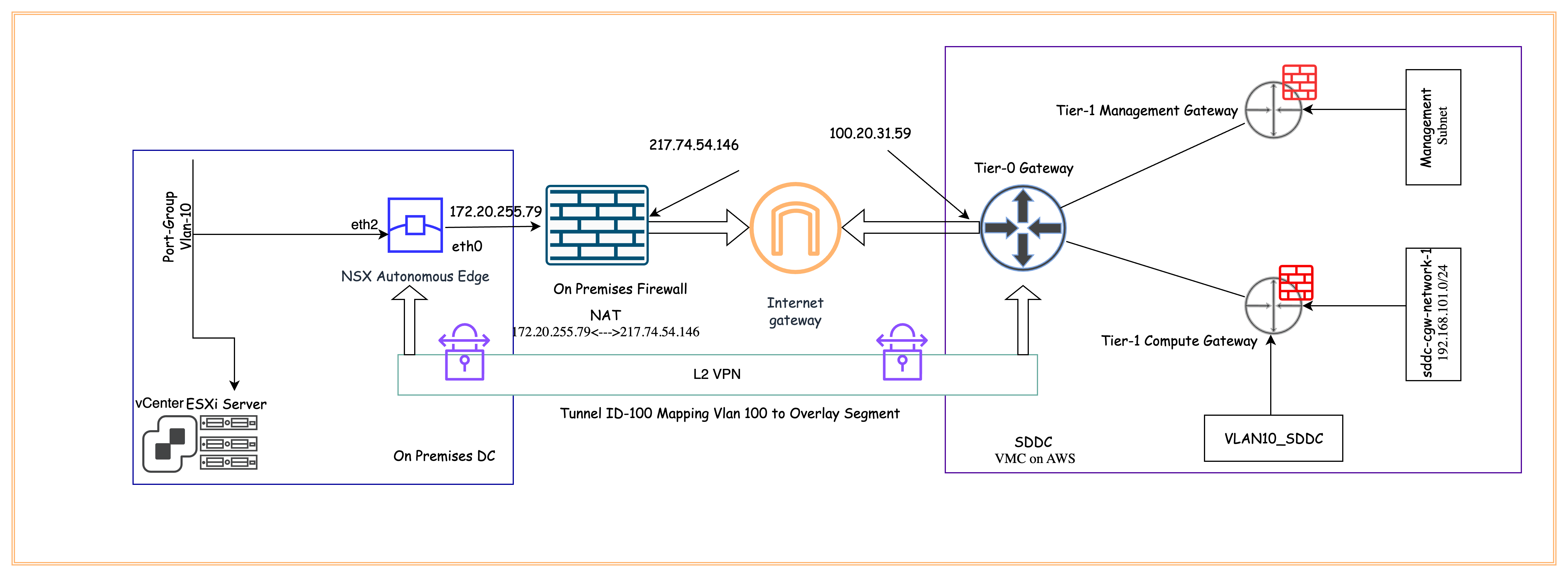 In our environment, NSX-T is already deployed on VMC on AWS. Management and Compute Tier-1 gateways are already deployed. NSX autonomous edge is already deployed in the legacy DC. Outside IP address of NSX autonomous edge is NATed to public IP address on the on -premises firewall. Another interface of the NSX autonomous edge is connected to the distributed port group, which has to be extended to VMC on AWS. We will extend existing Port-Group (Vlan-10) to logical segments in NSX-T on VMC on AWS.