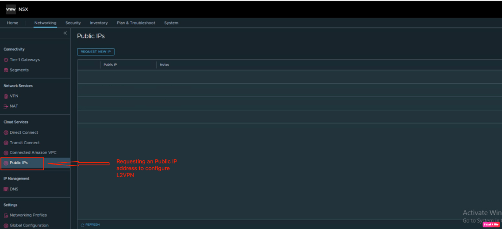 In the first step, we will request to get the public IP address from the AWS. In order to request an IP address, login to NSX-T manager, and navigate to Networking > Cloud Services > Public IPs